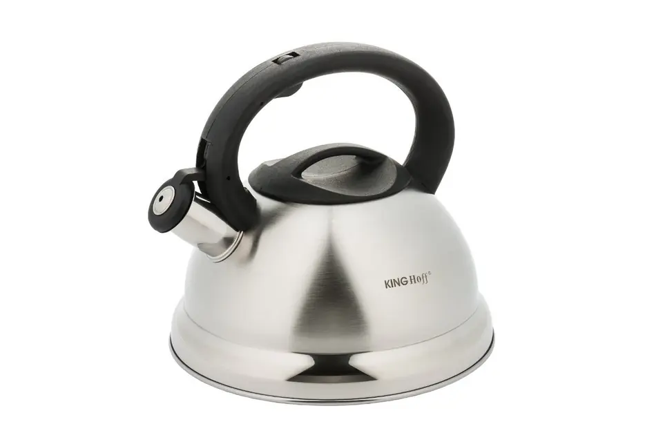 Boiling of water signaled by a whistle. Whistle raised by a button placed in the handle.
