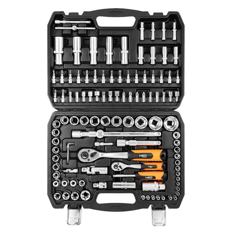 Key set 108 elements 1/2", 1/4" steel CrV, hexagon sockets 1/2" 17 pcs.: 10, 11, 12, 13, 14, 15, 16, 17, 18, 19, 20, 21, 22, 24, 27, 30, 32 mm, long hexagon sockets 1/2" 5 pcs.: 14, 15, 17, 19, 22 mm, ratchet 1/2", 72 teeth 255 mm, extension 1/2" 2 pcs.: 125 mm and 250 mm, sockets for candles 1/2" 2 pcs.: 16 mm and 21 mm, adapter for bits 1/2" - 5/16", reduction F3/8" x M1/2", cardan joint 1/2", torx socket 1/2" 8 pcs.: E10, E12, E14, E16, E18, E20, E22, E24; 1/4" hex sockets 13 pcs.: 4, 4.5, 5, 5.5, 6, 7, 8, 9, 10, 11, 12, 13, 14 mm; long hexagon sockets 1/4" 8 pcs.: 6, 7, 8, 9, 10, 11, 12, 13 mm L=50 mm; torx sockets 1/4" 5 pcs.: E4, E5, E6, E7, E8; ratchet 1/4" 72 teeth 155 mm, sliding knob 1/4" 115 mm, gimbal joint 1/4", extensions 1/4" 2 pcs.: 50mm and 100mm, screwdriver chuck 1/4" 150 mm, bits 5/16" 17 pcs.: T40, T45, T50, T55, T60, H7, H8, H10, H12, H14, PH3, PH4, PZ3, PZ4, flat 8, 10, 12 mm; screwdriver bits for sockets 1/4" 18 pcs.: T8, T10, T15, T20, T25, T27, T30, PH1, PH2, PZ1, PZ2, flat 4, 5.5, 7 mm, H3, H4, H5, H6; Hex wrenches 3 pcs.: 1.5, 2, 2.5 mm; 25 years warranty.