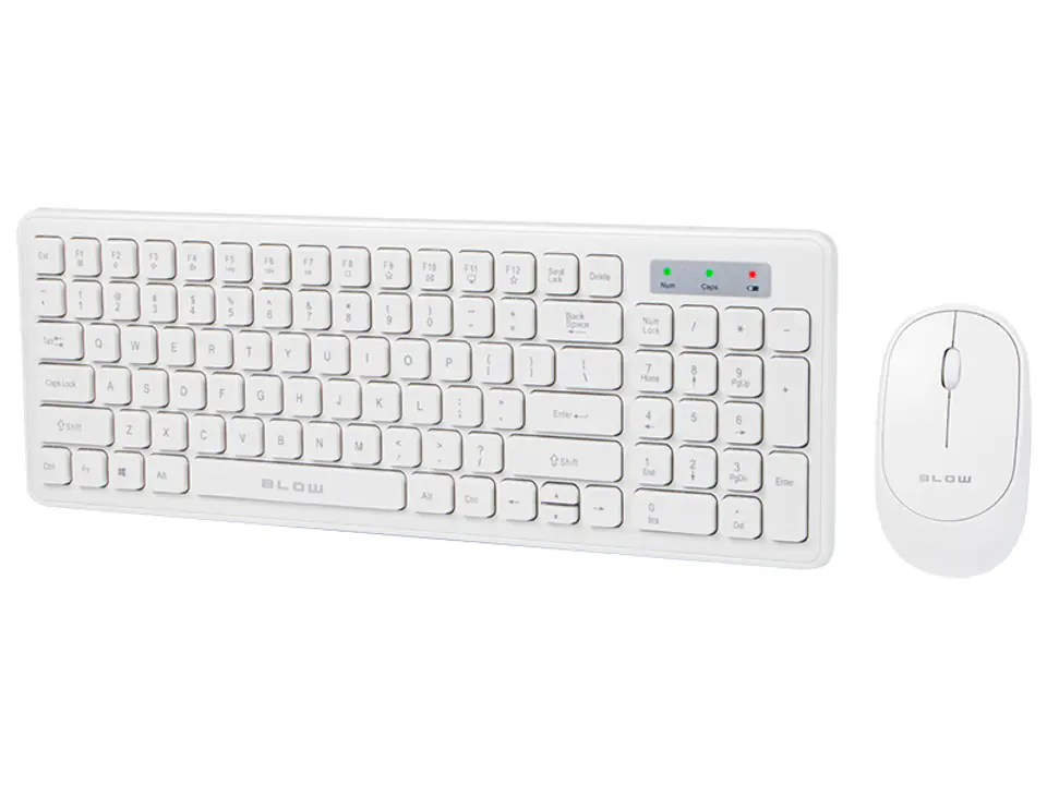 BLOW set consisting of a wireless keyboard and mouse. The devices connect to a laptop or computer using a small USB receiver. The set is characterized by a simple design, convenience of work and easy use.