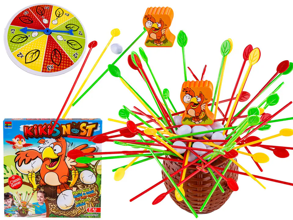 - Put all the colored sticks in an upright position into the brown basket, distribute the eggs between the players and place the Kiki figure next to the nest.