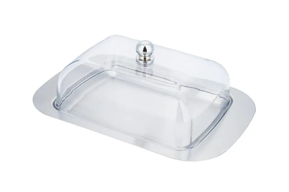 Steel-acrylic butter dish.