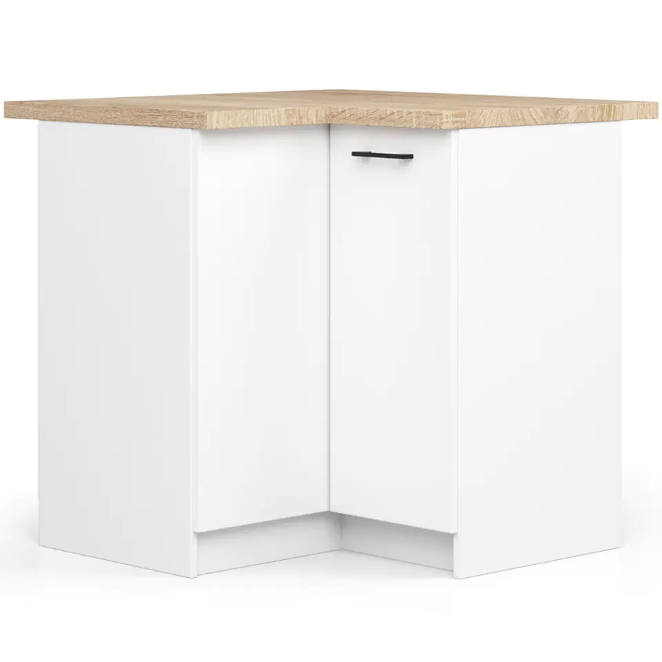 White corner kitchen cabinet 90cm by 90cm with worktops in Sonoma oak color. Modular kitchen cabinet.