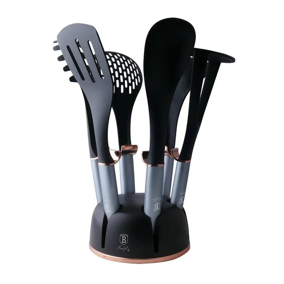 7-piece set of nylon kitchen utensils from BERLINGER HAUS from the Moonlight Collection line. Tools recommended especially for dishes with ceramic and Teflon coatings. The material from which they are made does not scratch the surface of the dishes. It is resistant to high temperatures up to 210 degrees C. It has special antibacterial properties.