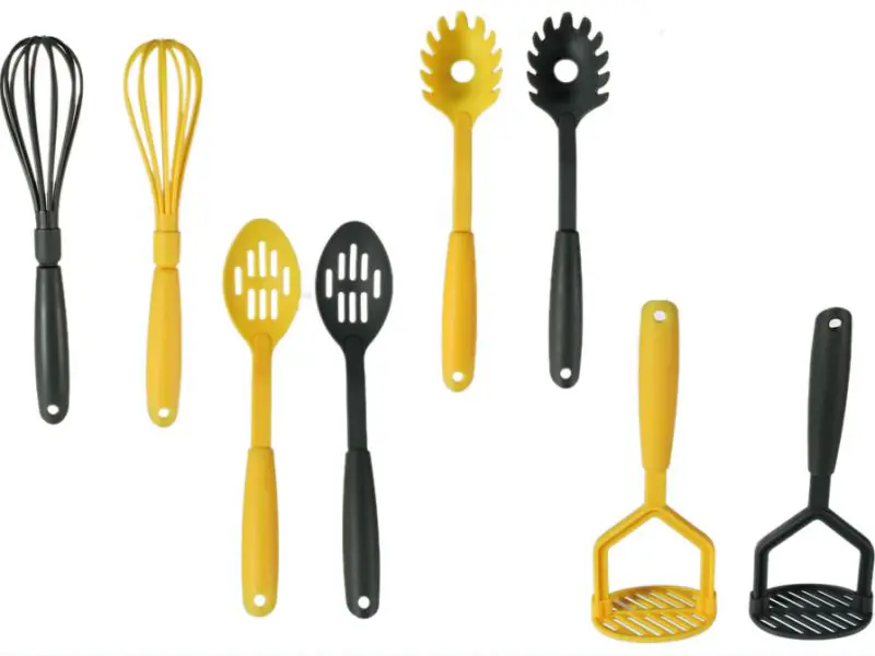 4 types of plastic kitchen utensils in two colors: gray and yellow. Very useful tools in any kitchen.