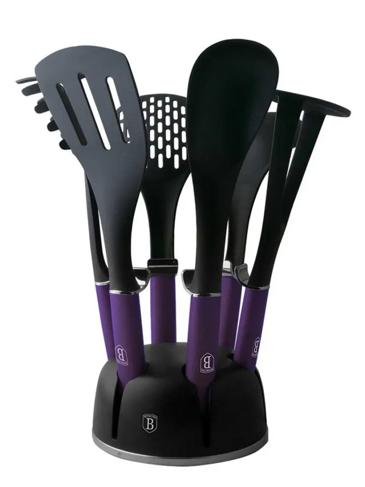 7-piece set of nylon kitchen utensils from berlinger HAUS from the PURPLE ECLIPSE COLLECTION line. Accessories recommended especially for dishes with ceramic and Teflon coatings. The material from which they are made does not scratch the surface of the vessels. It is resistant to high temperatures up to 210 degrees C. It has special antibacterial properties.