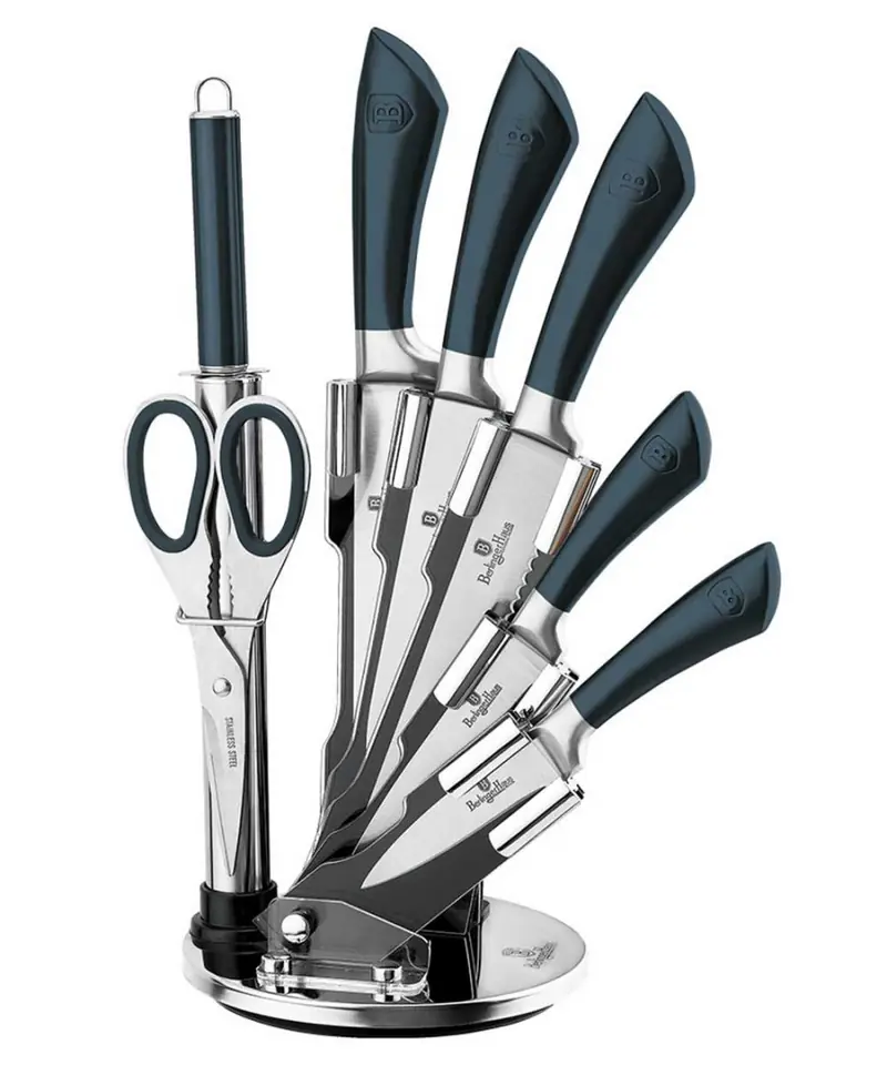 8-piece set of knives on a stand from BERLINGER HAUS from the AQUAMARINE series. Designed for portioning meat and fish, cutting bread and peeling and chopping vegetables. Knives made of high quality stainless steel Ferrinox 18/10 with a high carbon content of 1.4028/X30Cr13. An important feature of this steel is the fact that it is resistant to all kinds of scratches, scratches, is characterized by increased resistance to abrasion and corrosion. The blade is made of chrome-molybdenum steel, extremely hard, resistant to deformation, susceptible to sharpening. The knife was made according to the traditional art of one piece of steel. The transition between the blade and the handle is seamless. The handles are ergonomically molded and allow safe holding without slipping.