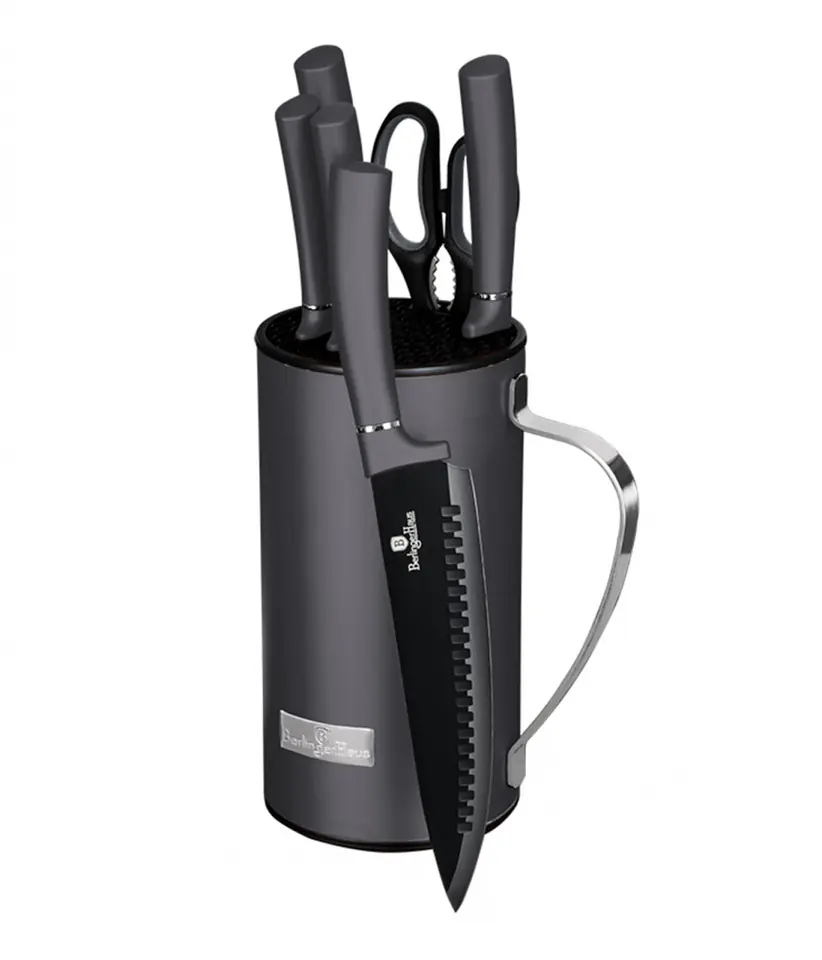7-piece set of knives in a block from BERLINGER HAUS from the Carbon Pro Collection series. Designed for portioning meat and fish, cutting bread and peeling and chopping vegetables. Stainless steel knives additionally coated with a non-stick non-stick coating. Equipped with handles covered with a very durable thin layer of silicone for a secure hold in all conditions.
