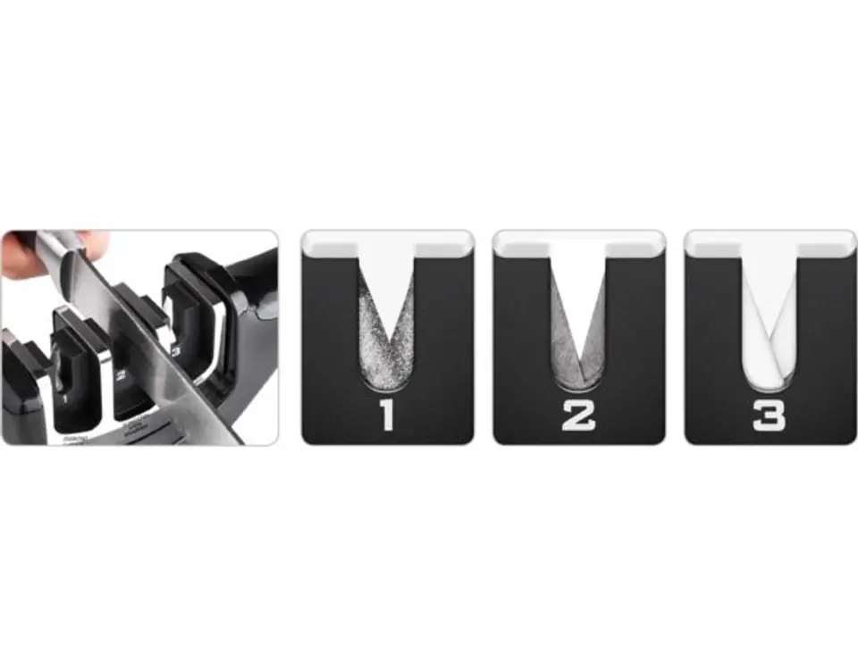 - The ceramic stone polishes the blade and evens out any surface irregularities