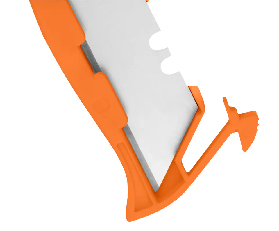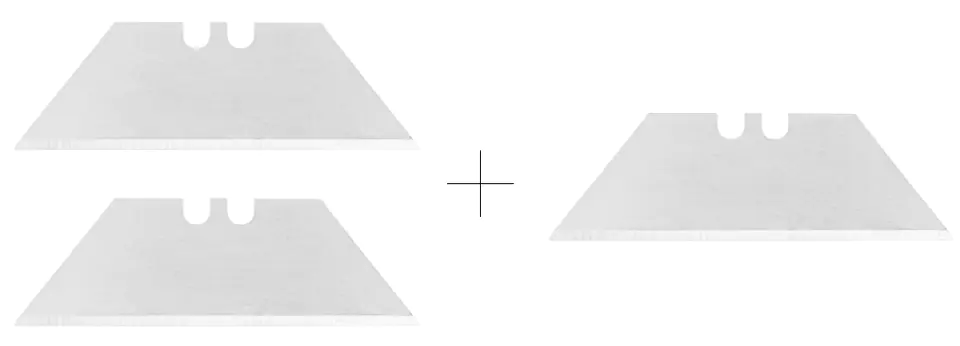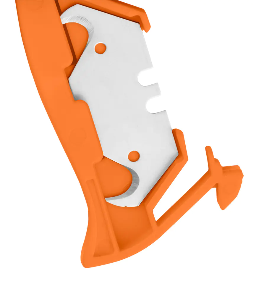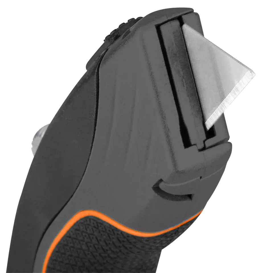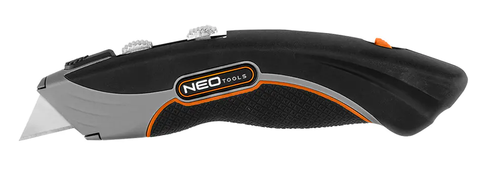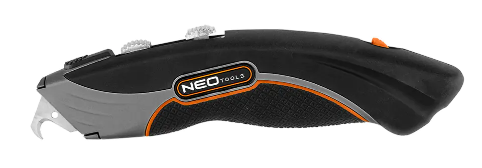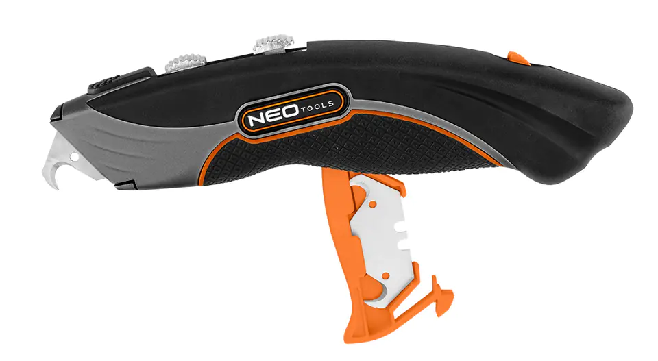 Knife with trapezoidal and hook blade light and durable zinc alloy body, two types of blades ready to use (hook and trapezoidal), blade lock, magazine for spare blades with lock, 3 hook blades (2 spare), 3 trapezoidal blades (2 spare), two-component handle including TPR increasing the comfort of work, quick and easy blade change mechanism, size 179x48, 5x29mm.