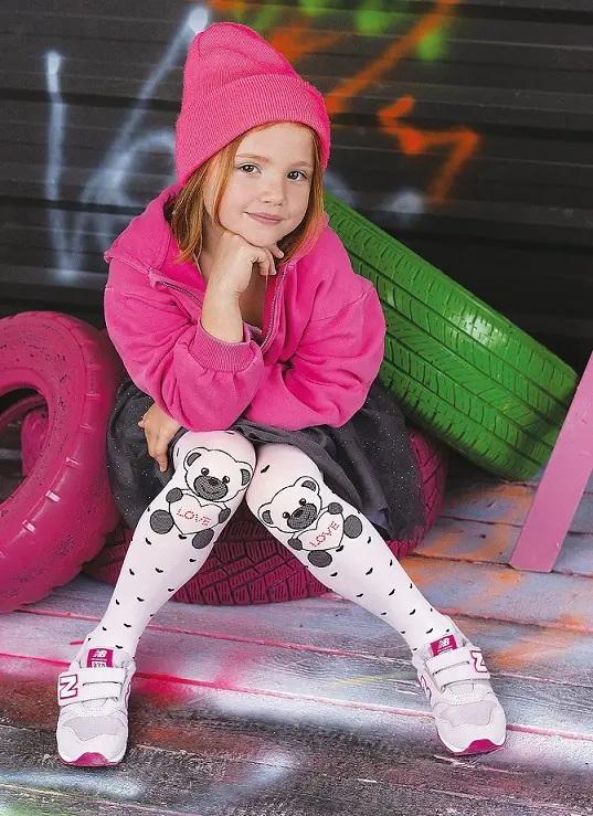 Wzorzyste rajstopy dziecięce wykonane z mikrofibry o grubości 40Den. Ozdobione kolorowym wzorem misia i serduszek oraz połyskującymi dżetami Skład: 94% poliamid, 6% elastan.