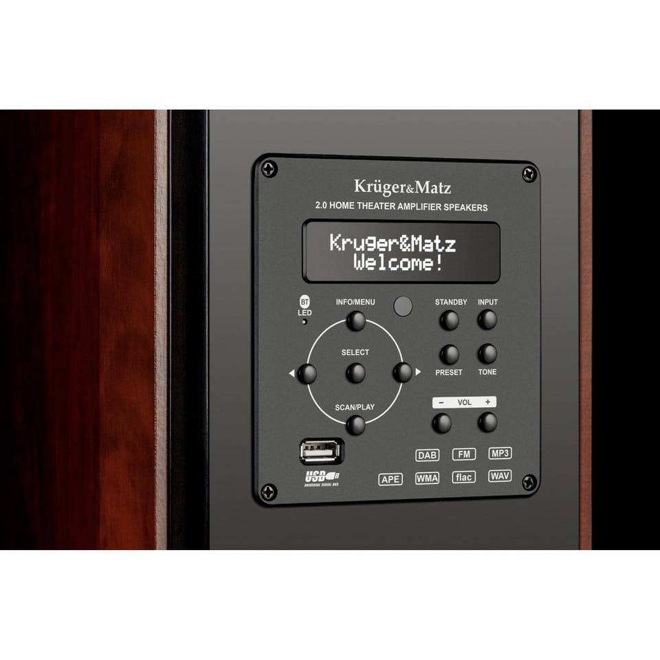On the front of the Kruger & Matz Passion 2.0 loudspeakers there is a control panel that allows you to manage the functions of the set. In addition to the buttons, there is a display that increases the comfort of use and a Bluetooth indicator, informing about the pairing of devices.