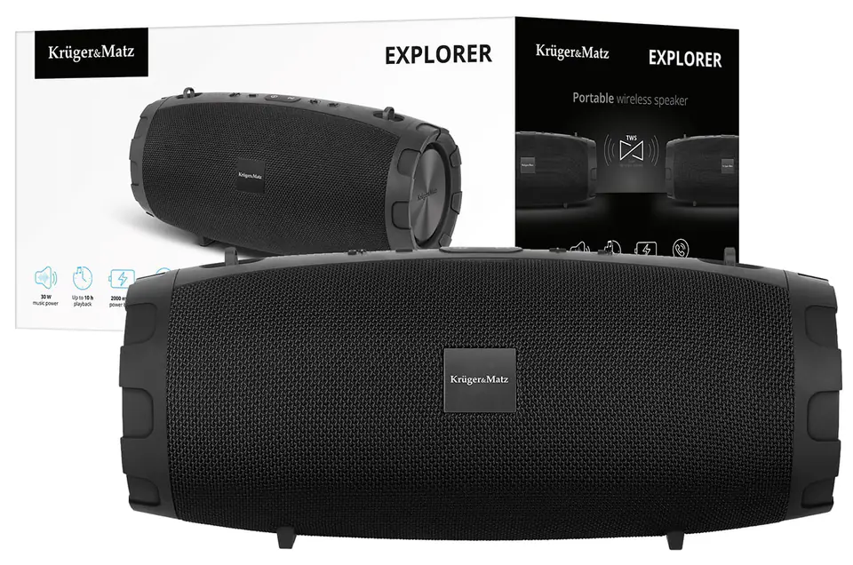 Additional functionality is also important in Bluetooth speakers. With this in mind, the Kruger & Matz Explorer portable speaker is equipped with an additional USB port that allows you to charge external devices. The device also has a built-in microphone that will allow you to handle voice calls. In addition, this model also has the True Wireless Stereo function, thanks to which you will be able to connect two Explorer speakers together, doubling the dose of music.
