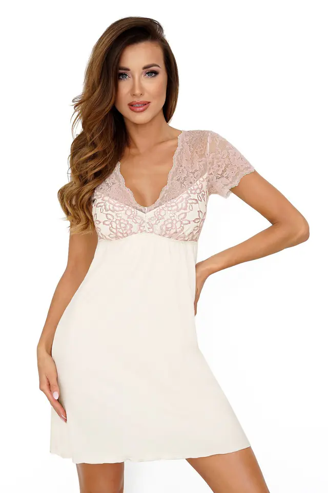 Subtle and effective at the same time ALEXIA nightshirt. The cut refers to the classic "little black" – fitted, emphasizing the waist, with a deep and narrow neckline. It is distinguished by an original binding in the upper part - embroidered with shiny thread lace creates an impressive top layer of the shirt. The decorative material extends from the shoulders, through the neckline, to the cut off under the bust. Intricately embroidered roses sparkle, catching every ray of light. The t-shirt is available in two color variants – black combined with deep red and navy blue combined with light turquoise. Shirt packed in an elegant box.