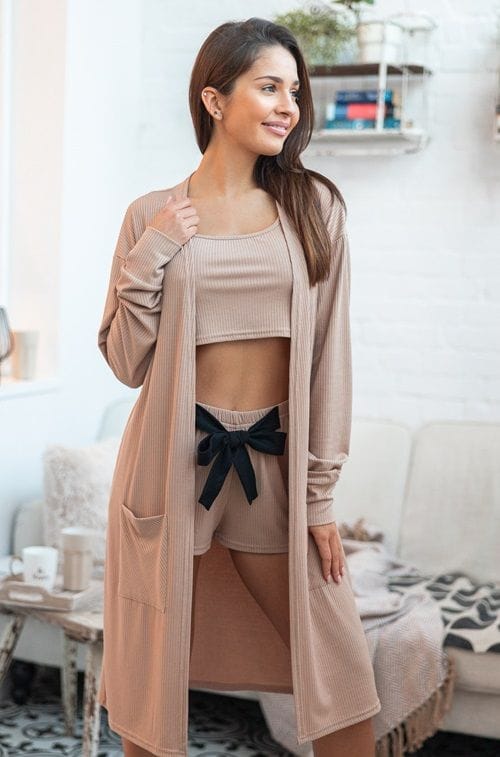 A long cardigan in a color inspired by cappucino, which will successfully replace your bathrobe. Made of ribbed knitwear, without fasteners, with two pockets on the sides. Perfectly fits pajamas and sets Sofia, Mireia, Laida. Composition: 62% polyester, 33% viscose, 5% elastane.