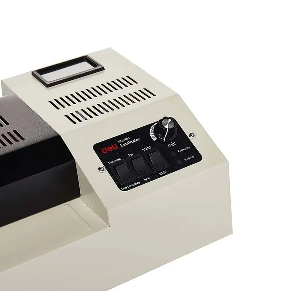 The knob located on the right side allows you to set the operating mode of the device: lamination to hot or cold, and temperature. The product has overheating protection, so it is safe to use it. It is recommended to use laminating bags with a thickness of 50 - 200 microns of the Deli brand. The indicator will inform you about the status of the device.