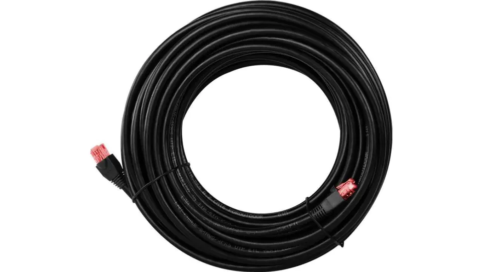 CAT 6 black LAN cable, gel-filled for outdoor use, terminated on both sides with RJ45 plugs. Unshielded U/UTP cable.