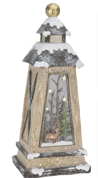 Lantern 60 cm LED lantern with picture rectangular shape Unique decoration in the pre-Christmas period as well as during Christmas. The lantern will perfectly fit into any interior, giving at the same time a festive atmosphere. The lantern will be a wonderful decoration for the winter, festive time. It is also perfect as a gift for loved ones. Technical data: Dimensions: 24 x 20 x 60 cm Bulb: LED Power supply: on batteries, not included Batteries: 3 x AA Light: flashing warm white Lantern walls: image of trees and snow