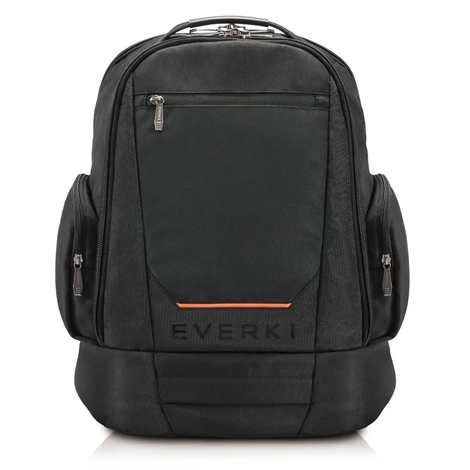 EVERKI ContemPRO backpack from the PREMIUM series designed especially for professional life. With its stylish black appearance and tasteful design, it fits perfectly into both the meeting room and public transport on the way to the office. In situations where carrying a backpack seems inappropriate or inappropriate, two leather handles allow it to be carried like briefcases. The backpack is decorated in the brand's colors, contains orange accents.