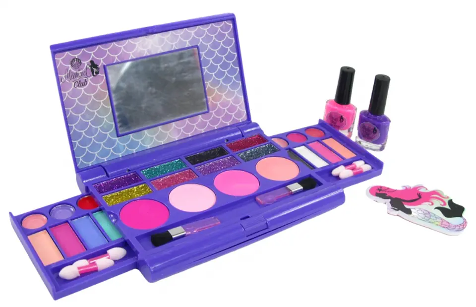 A large, impressive cassette containing a mirror and as many as 16 colors of eye shadows, 6 lip glosses and 4 shades of blush for cheeks, 2 brushes, 4 applicators, 2 varnishes, a set of rhinestones for nails, and all this decorated with a mermaid motif.