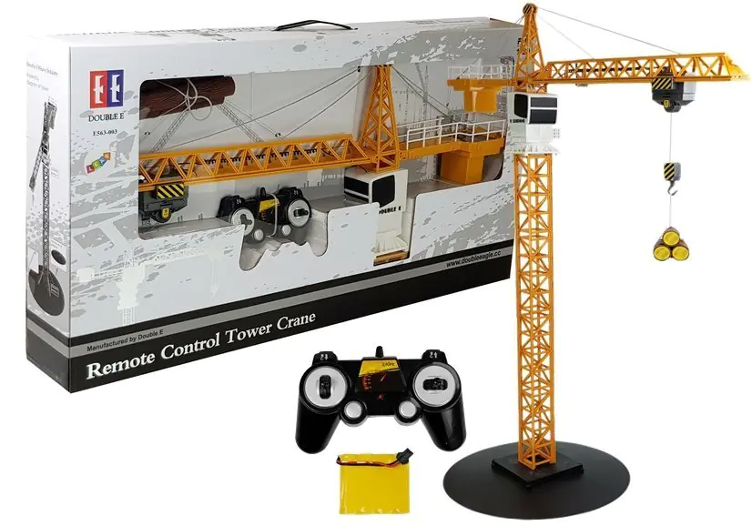 Remotely controlled fully functional tower crane with a height of about 1 meter. The magnificent Double Eagle crane is a faithful copy of a real machine in 1:20 scale. The highest quality of the toy and its durability will be appreciated by every toddler who likes to play with all kinds of vehicles and construction machines.