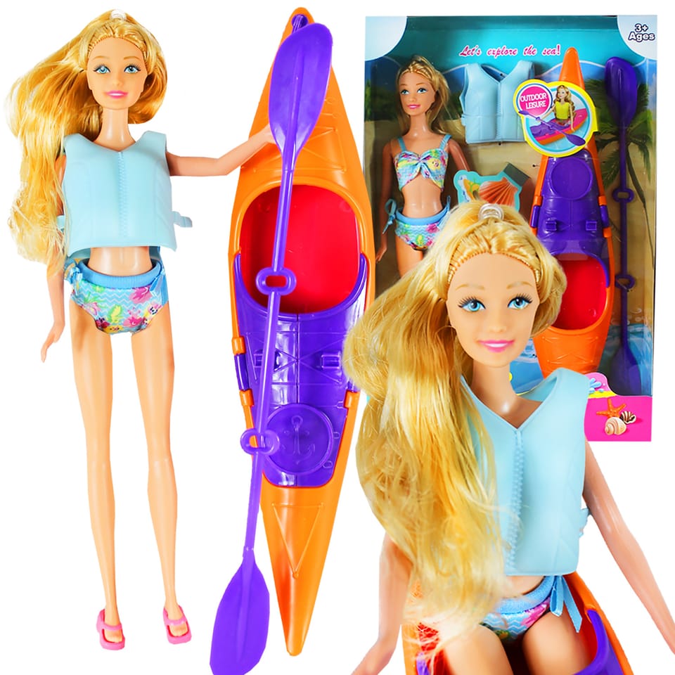 Beautiful doll impresses with incredible beauty - shiny hair, large, blue eyes and a dazzling swimsuit. He loves to swim his colorful kayak.