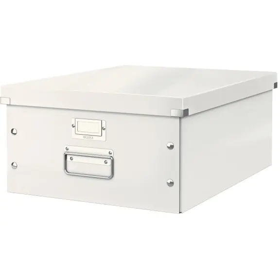 Large, universal box for storing items in formats up to A3. Foldable to save space when not in use. Durable metal handles for easy carrying. With a label frame to describe the content. Made of high-quality durable cardboard. Laminated surface and metal corner elements provide solid protection. Modern design fits perfectly into any office.