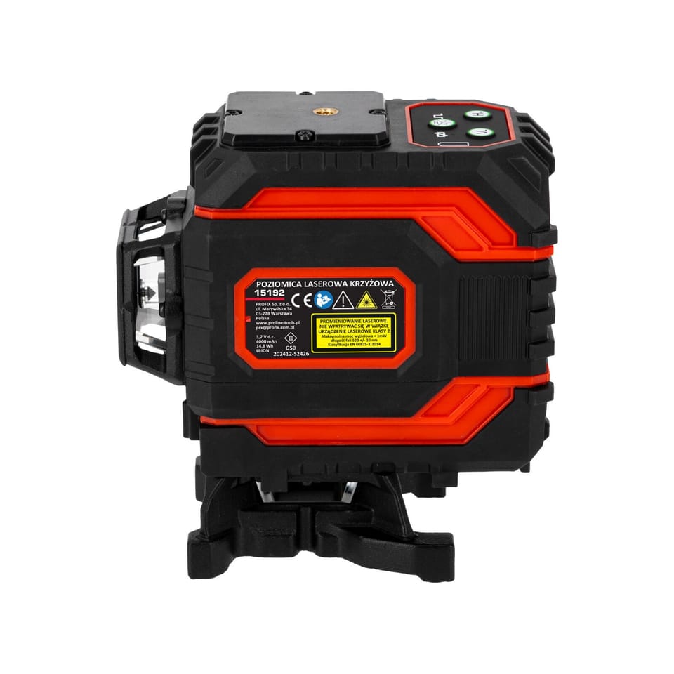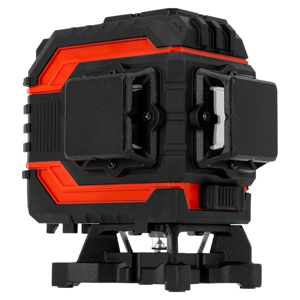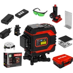 - The set includes glasses that improve the visibility of the laser beam, a battery charger, a holder with a magnet, a rotating base, a remote control, a base that allows the laser to be lifted vertically, and additionally in the 4D model a holder that allows the laser to be hung from above