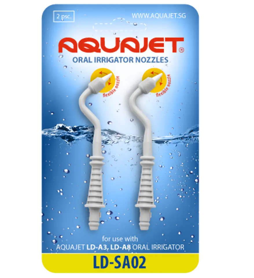 AQUAJET LD-SA02 terminal. Package quantity: 2 pack Designed for use with oral irrigators AQUAJET LD-A8, LD-A3. Features:- soft tip head allows painless contact with sensitive gums and teeth- safe and easy to use by children- easy to detach from irrigator handle Consumable. You will find the rules of use, maintenance, storage and transportation in the instruction manual of the oral irrigator. Lifetime of at least 1000 cycles of use. Storage period not limited.