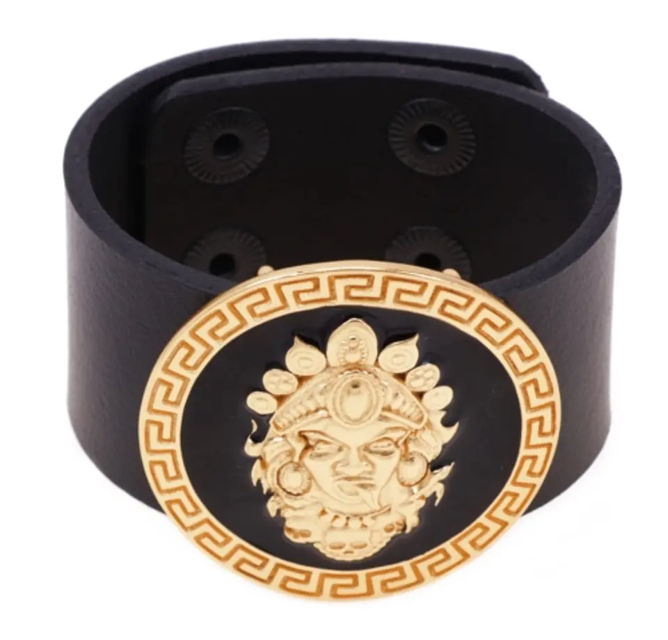 The latest collection! Leather bracelet with hand-created and enameled, round buckle plated. Motif of the Hindu goddess Kali. Bracelet length minimum 18cm, maximum 20cm, width 3.3cm, buckle diameter approx. 4.5cm