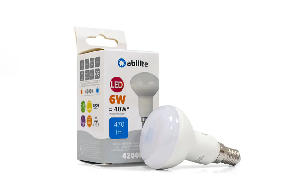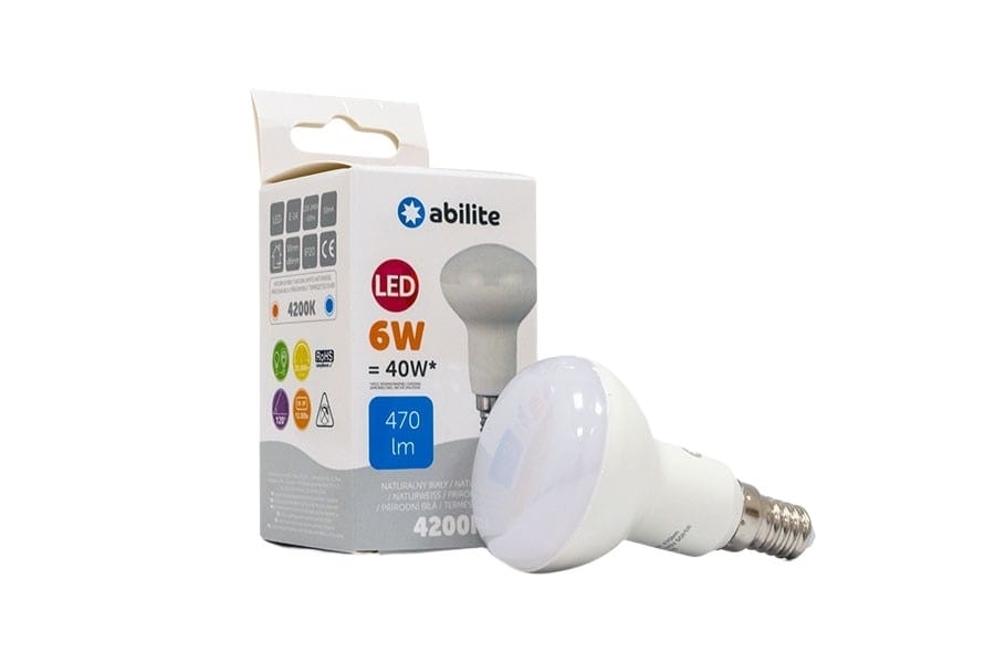 Neutrally white light emitting a reflector-shaped bulb with a very long lighting time and high brightness, with low power consumption. Mounted in E14 connector. Thanks to its high resistance to all kinds of shocks and impacts, it is characterized by a very low failure rate. Abilite LED means up to 80% electricity savingsDid you know that by replacing standard bulbs with LED lighting you can save up to 80% of energy? The purchase of LED lighting will pay for itself very quickly, and you will reduce your electricity bills and save money and the environment. Abilite LED, white light like in your old bulbBy choosing Abilite LED lighting, you can decide whether you want it to emit warm, cozy light like regular incandescent bulbs (warm whites), or whether you want cool white to motivate more action (cold white). Abilite LED bulbs are available in a wide range of sizes and shapes that you are familiar with from ordinary incandescent bulbs. You can easily find the shape that suits your needs. Abilite LEDs are faithful and natural colorsAbilite LED lighting products have a high color rendering index (CRI), thanks to which they very faithfully and naturally reproduce the colors of the illuminated objects. Abilite LEDs light up right after switching onDo not wait until your lighting reaches maximum brightness, our LED light sources shine with full brightness as soon as you turn it on.
