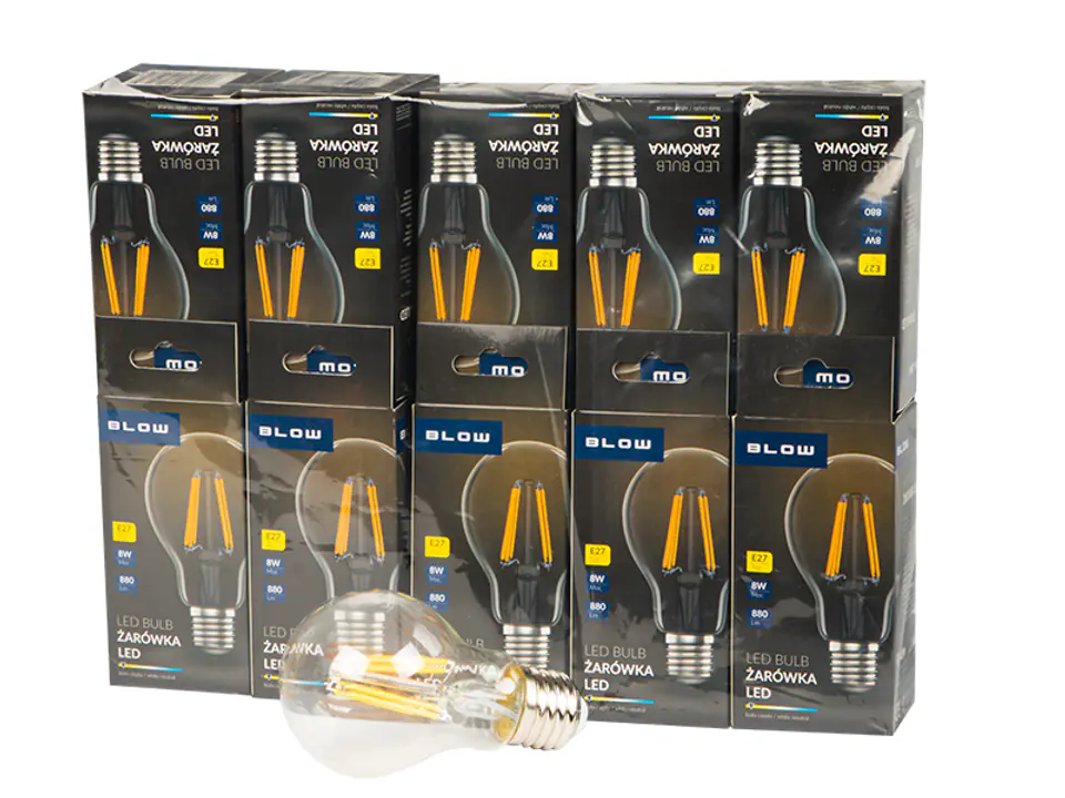 A set of 10 pieces of classic bulbs with transparent glass of the BLOW brand were made using modern solutions using innovative LED technology, which are characterized by high efficiency of light parameters, faithful color reproduction of illuminated objects and extremely long durability. Ideally suited as a decoration in classic and modern ceiling lamps.