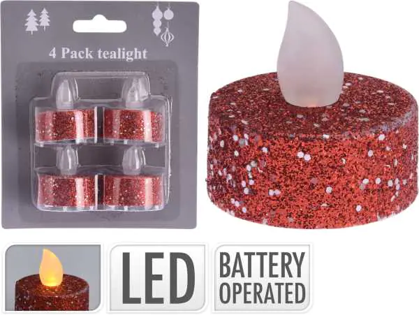 Set of 4 red LED tealight candles with glitter A set of imitating tealight warmers sprinkled with red glitter, can be used for all kinds of Christmas decorations. They look beautiful both set on a table, fireplace or window, as well as in candlesticks and lanterns. Specification: set of 4 candles in red, diameter: 3.5 cm, height: 2 cm, material: plastic, weight 1 pc. 14 g, power supply: CR2032 batteries (included).