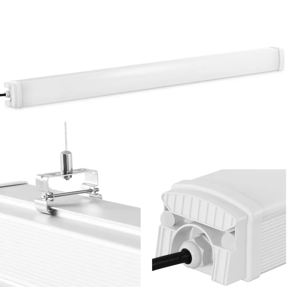 Manufacturer's code: 10280058The Wiesenfield luminaire will work well in barns, poultry houses, warehouses, factories, workshops, garages and in private use in attics or cellars. The lamp has dimensions of 1200 x 91 x 75 mm. It has a high IP65 protection class, perfect for wet and dusty places. It is made of solid, corrosion-resistant materials. The luminaire does not flicker, nor can it be dimmed. The lamp power is 60 W. It is adapted to SMD 2835 LEDs. The light is transmitted from an angle of 120 degrees, and its flux reaches the value of 6600 lm. (110 lm/W). The luminaire has been adapted to waterproof male and female connectors, which need to be adjusted. A maximum of 33 luminaires can be combined (power less than 2000).