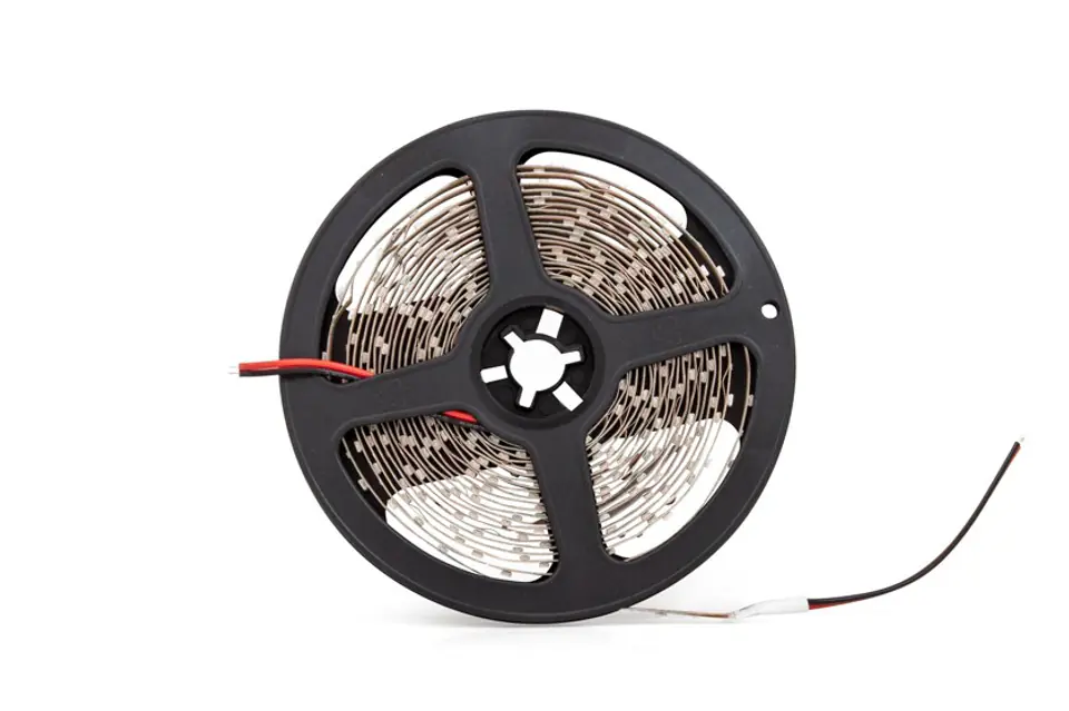 Flexible lighting strip in warm white, 5m long, equipped with 300 LEDs, thanks to which it consumes up to 95% less electricity than traditional lighting. Thanks to the flexible laminate, it allows you to obtain almost any shape, and its small dimensions allow you to use in the most inaccessible places, thanks to which it is irreplaceable when highlighting furniture, suspended ceilings, stairs, shop windows, niches and arches, or for creating luminous inscriptions. The LEDs used in the strip offer high brightness and wide lighting angle with a very high service life. Double-sided adhesive, strong tape on the product allows it to be permanently attached to the substrate. REMARK! LED bulbs and strips do not work with electrical transformers. The use of such power supplies will cause permanent damage to the light source (such damage is not covered by the warranty). For LEDs operating on 12V DC current, it is recommended to use only stabilized switched-mode power supplies. For LEDs operating at 12V AC/DC current, it is allowed to use toroidal transformers with a working range from 0W or stabilized pulse transformers.