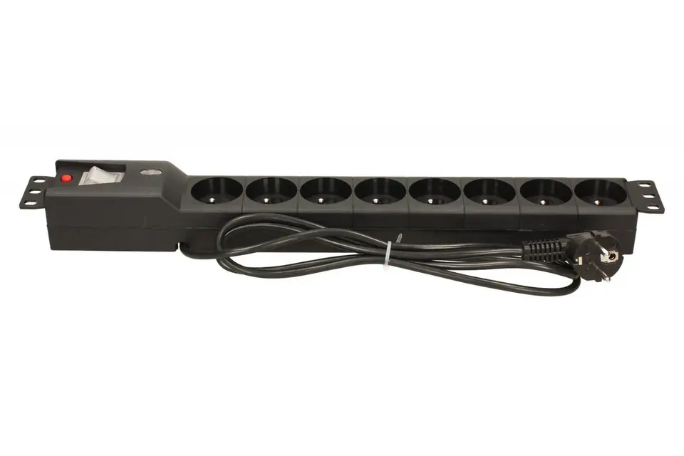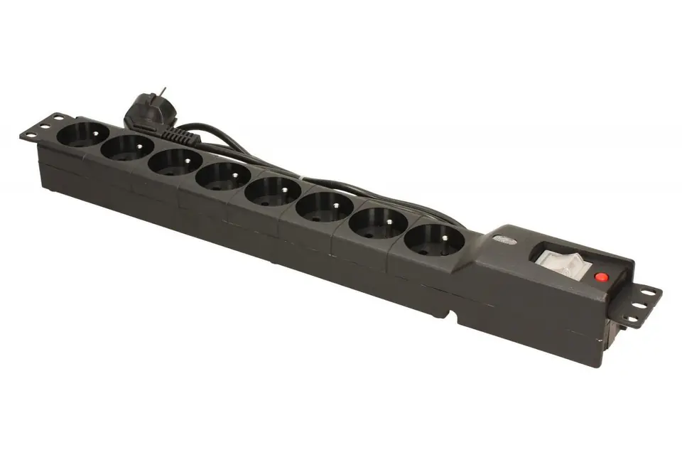 Power strips for cabinets 19 "control system state protection, resettable fuse and a new system of conducting wire in 4 directions. Strip has a rate of correct operation of the protective thermal fuses protection varistors. Safe, tested housing made of high impact nylon. Resettable Fuse protection device against overload. Protection against accidental switching strips.