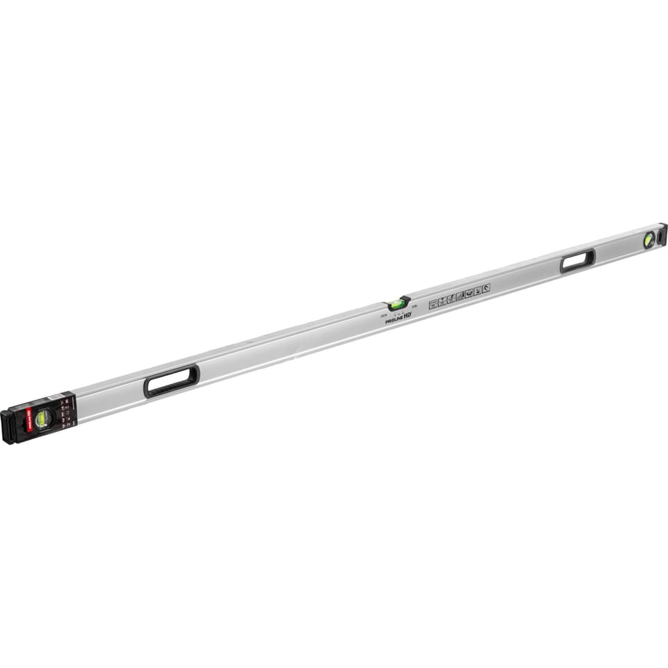 - A spirit level with handles from the PROLINE HD series, made of a rectangular aluminum profile, thick extruded aluminum profile