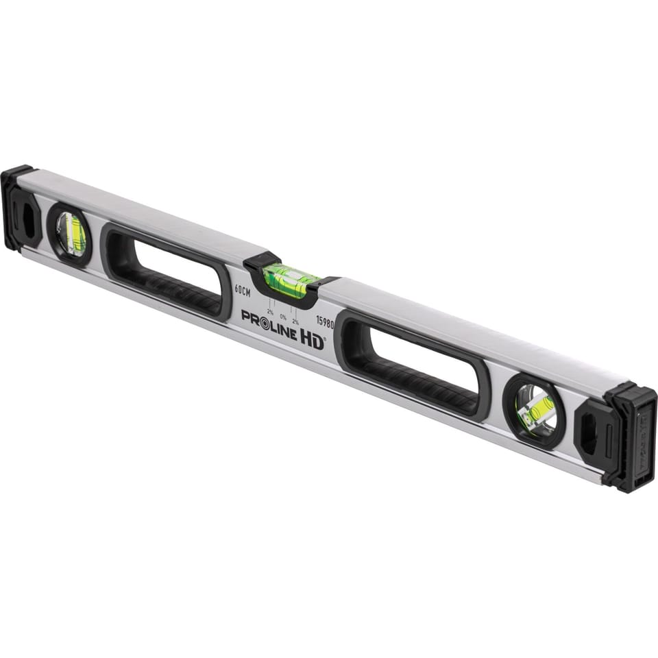 - A spirit level with handles from the PROLINE HD series, made of a rectangular aluminum profile, thick extruded aluminum profile