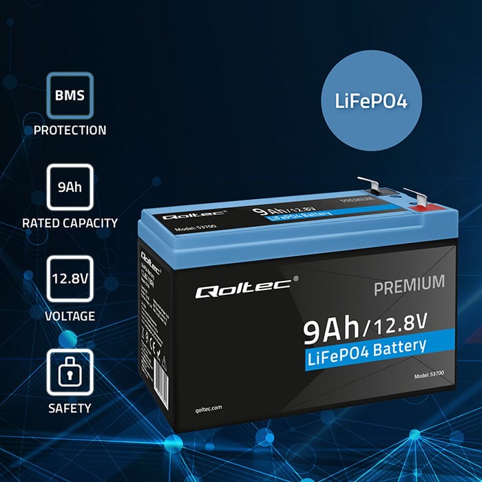 Get efficiency at the highest levelIf you are looking for a long-lasting energy source, the LiFePO4 battery from Qoltec will be a very good investment. This type of battery is all about thermal and chemical stability, allowing you to work in very extreme conditions without compromising the performance of the battery and allowing it to retain its full capacity.Advanced LiFePO4 technology - more power, less chargingOur batteries are extremely efficient and resistant to deep discharges. They are characterised by a longer service life while maintaining their properties of more than 3000 charge and discharge cycles, and this gives them a major advantage over other batteries currently available on the market. In addition, they are non-polluting, recyclable, non-toxic and non-flammable.Ensure a reliable source of energyLiFePO4 batteries are durability and performance in one :