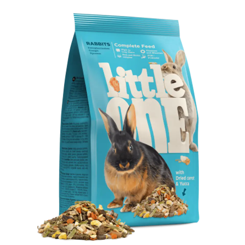Rabbit food Little One is a complete diet with the addition of vitamins and minerals, balanced according to the nutritional requirements of rabbits. The diet is rich in fiber, necessary for proper digestion. The feed contains dried vegetables, pea flakes, greens and rare fruits. Ingredients: grass granules, carob, puffed wheat, pea flakes, puffed corn, blown barley, carrot flakes, sunflower seeds, alfalfa, fructooligosaccharides, yucca extract.