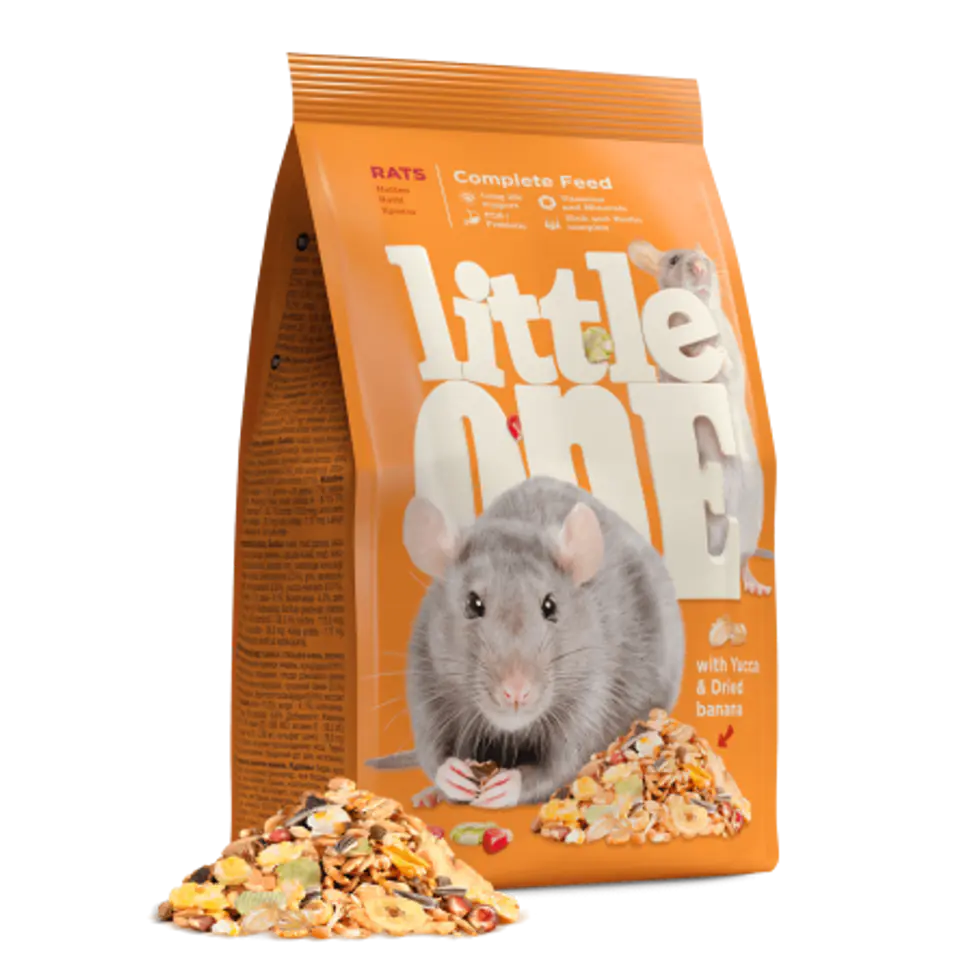 Little One rat food is a complete feed with vitamins and minerals. The feed consists of various ingredients such as: cereals, seeds, flakes, puffed grains, fruits, vegetables and delicious crispy extruded granules. The addition of dried banana makes rats eager to eat food. Ingredients: wheat, barley flakes, shelled oats, multigrain granules, puffed wheat, barley, red corn, oats, cornflakes, pea flakes, carob, sweet lupine flakes, puffed corn, dried banana, buckwheat, sunflower seeds, bean flakes, fructooligosaccharides, yucca extract.
