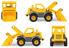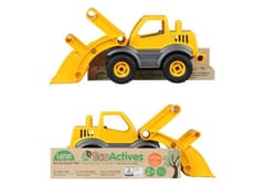 Loader manufactured in an eco-friendly way using recycled materials and admixtures of wood. Features movable parts. Hinged cab.