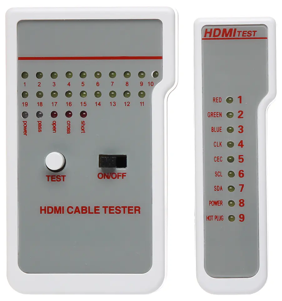| Features: | HDMI Cable Tester with remote unit, LEDs and sound signals indicating correct or error of the connection, Tested media: audio/video |