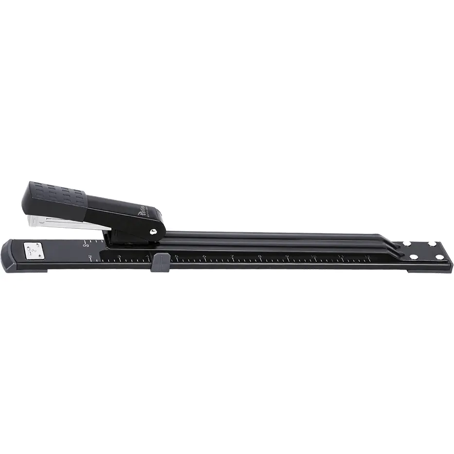 Metal long-arm stapler. Stapling closed and open. Additionally equipped with a centimeter and inch scale. Suitable for staples of 24-6 - 26/6 mm. Staples up to 25 sheets. Insertion depth: 310 mm. Colour: black.