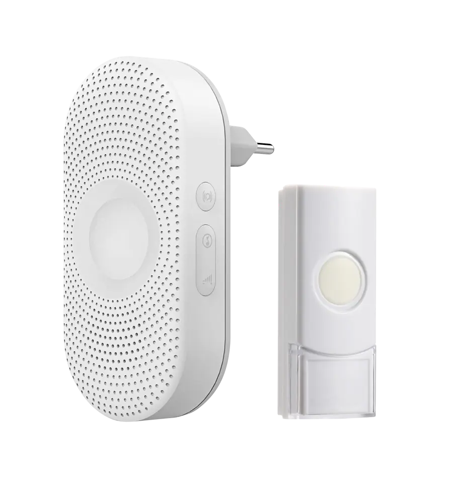 Wireless, network doorbell is designed for use in homes, apartments, offices, hospitals, shops, etc. No bell installation required. The doorbell (receiver) is switched directly into the ~230V mains outlet, while the transmitter is powered by a 3V CR2032 battery. The learning system function allows you to log in additional buttons (max. 4). The radio frequency of 433.92MHz is used in transmitting and receiving the signal. The range of the bell in the open area is 300m. The receiver has a 6-step volume control up to 80dB and 36 polyphonic ringing tones.