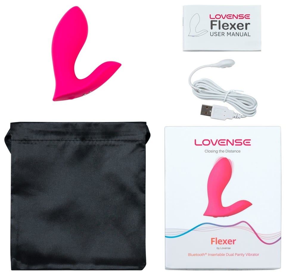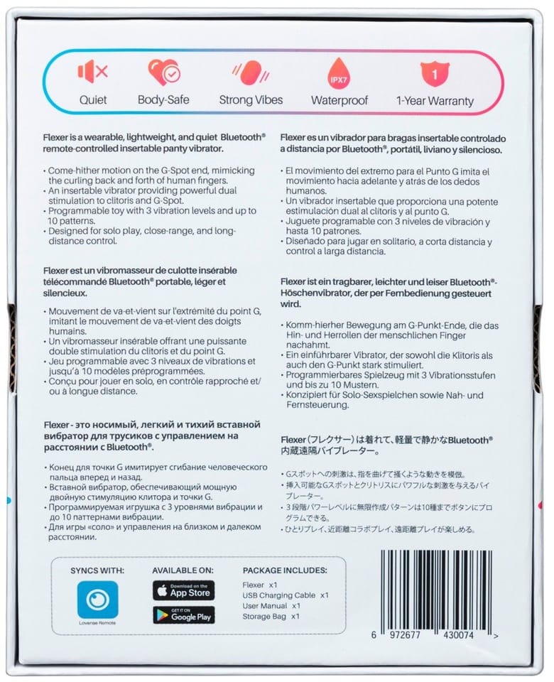 Meet Flexer - our new wearable, lightweight and quiet App-controlled insertable panty vibrator. Flexer can take your public play experience to a completely new level. Thanks to its design, no one will notice your tiny vibe that you can use "on the go". A must add-on toy to any sex toy collection. It doesn't matter if you've never bought a toy before or you have an entire mountain of them! Amazing power to satisfy even the most intense vibration seekers.Three Independent MotorsChoose to activate clitoral vibrator, G-Spot vibrator, or come-hithermovement independently.Come Hither MovementsThe insertable part provides pressure and motion against the G-Spot,creating fingering sensation.WearableHands-free and comfortable to wear in any set-up, under any clothes.Very PowerfulEach motor provides super-intense stimulation which provides pleasure in the entire vaginal area.Additional NotesThe claim that Flexer lasts 120 min after a full charge is under the assumption that you run it at Level 1 (the first vibration mode).Here are the specs:Flexer:- Materials: Body-Safe Silicone- Weight: 95 g- Charging: 60 Minutes- Use Time: up to 120 Minutes- Standby: up to 120 Hours- Waterproof: IPX7 Waterproof