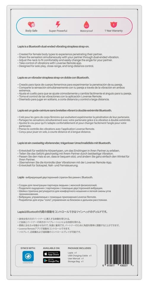 Two bodies, one shared pleasure. Designed with flexible neck to fit and change angles to be comfortable for both wearer and receiver.Lapis offers three stimulation and vibrations for G-spot, P-spot, and C-spot. Perfect sex toy for penetrative sex no matter user share lesbian, bisexual or questioning. Shared vibrations can be adjusted to however users and their partners like. The claim that Lapis lasts 156 mins after a full charge is under the assumption that you run it at Level 1 (the first vibrating mode). Here are the specs:- Materials? Body-Safe Silicone- Weight? 315g/11oz- Charging? 105 Minutes- Use Time? up to 156 mins at the lowest level up to 58 mins at the highest level· Standby? up to 120 Hours-Waterproof?IPX7 WaterproofLightweight: At ONLY 11 to prevent tiredness from wearing compared to other strapless strap-ons.Flexible neck for changeable angles: Adjust to fit and change angles to be comfortable for both the wearer and receiver.Stimulations for wearer & receiver:Wearer: G-spot simulation and vibrations via insertable bulb to feel pressure and vibrations as thrust;Ridged grooves for the clit and entire vaginal area through grinding or vibrations.Receiver: G-spot or P-spot stimulations via insertable bulb while partner thrusts; Ribbed shaft adds extra stimulation as it slides in and helps distribute vibrationsSmoothness: Body safe materials is firm but soft for a realistic skin-like feeling.Long Distance: Maintain intimacy with your loved one.Sync your toys together or have long distance sex with a video or voice call.