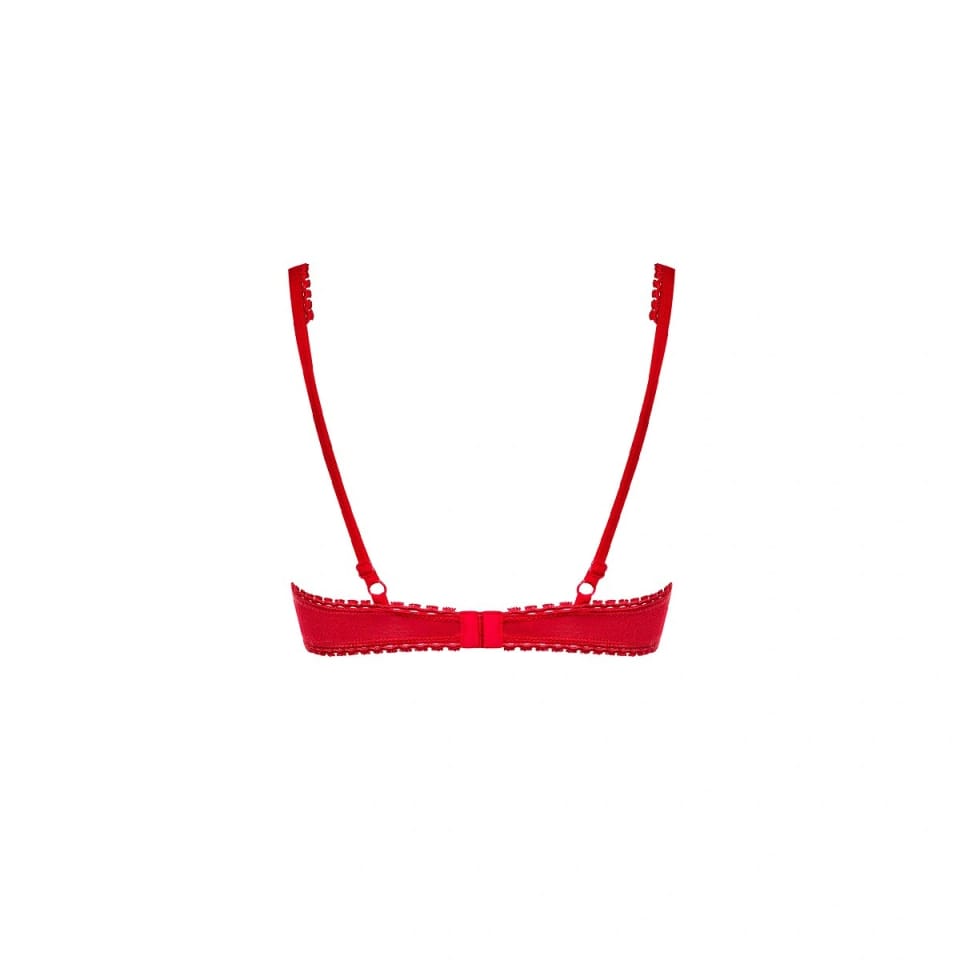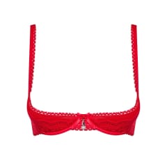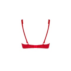 A red, half-open bra in which you will charm your man... Captivating and sensual, on underwire, stiffened at the base, with push-up inserts. In this model, your breasts will look extra. A color that seduces the senses, a center with a shiny tag. Circumference fastened with hooks. Composition: 85% polyamide, 15% elastane.