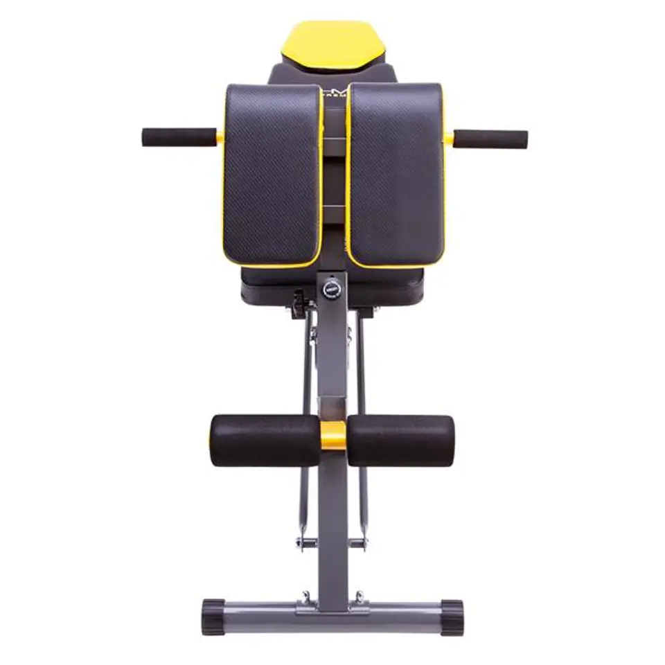 LSR8311 HMS PREMIUM is a combination of a classic exercise bench with a Roman bench. The 3 in 1 bench LSR8311 is a classic bench combined with a Roman bench, such a combination, gives the opportunity to perform upper body training, using dumbbells or a barbell, as well as exercises involving the extensor of the back, two-headed thigh muscles or buttock. The Roman bench can in this case also be used as a prayer book and perform an exercise involving the biceps muscles. Handles on the sides will work well for performing push-ups. We can not forget that by setting the bench obliquely downwards, it is possible to make bends, i.e. crunches. This setting is also an attractive option when squeezing dumbbells or barbells. This allows you to develop the chest muscle more widely. Comfort and convenience A solid board ensures the stability of the backrest, and a soft sponge guarantees comfort and convenience during exercise. The thickness of the sponge is very important, because it has a direct impact on the perfect position of the body. Modern carbon upholstery is resistant to moisture and sweat and prevents the body from slipping during exercise. It is also very pleasant to the touch. Many possibilities of adjustment The bench has adjustments to the angle of inclination of the backrest, height adjustments of the backrest of the Roman bench and adjustments to the angle of inclination of the leg holder. Such extensive possibilities of maneuvering the setting of the bench will allow you to freely adjust it to the user's height and to a specific exercise. Stylish design The bench is not only comfortable and functional, but also stylish. The combination of black carbon material with yellow embroidered elements gives a great visual effect, which is characteristic of the HMS PREMIUM brand. All components of the LSR8311 HMS PREMIUM bench make it a multi-purpose product that will work great in any home gym. Specification: Material: steel, sponge, wood, PVC Dimensions: Length: 146 cm Width: 64 cm, 43 cm – without pump holder Height: 49 - 85 cm Backrest: Length: 98.5 cm Width: 32.5 cm Thickness: 5 cm Thigh rest: Length: 29.5 cm Width: 16 cm (one element), total width 36 cm Thickness: 5 cm Height: 73.5 – 88.5 cm Leg holder length: 36 cm Pump holder Total length: 64 cm Handle length: 12 cm Handle diameter: 31 mm Adjustments: Backrest: 3 levels Thigh rest: 7 levels every 2.5 cm Leg holder: 4 levels Maximum load: Roman bench: 100 kg Flat bench: 160 kg Product weight: 13.5 kg Notes: Not intended for commercial use Warranty 24 months