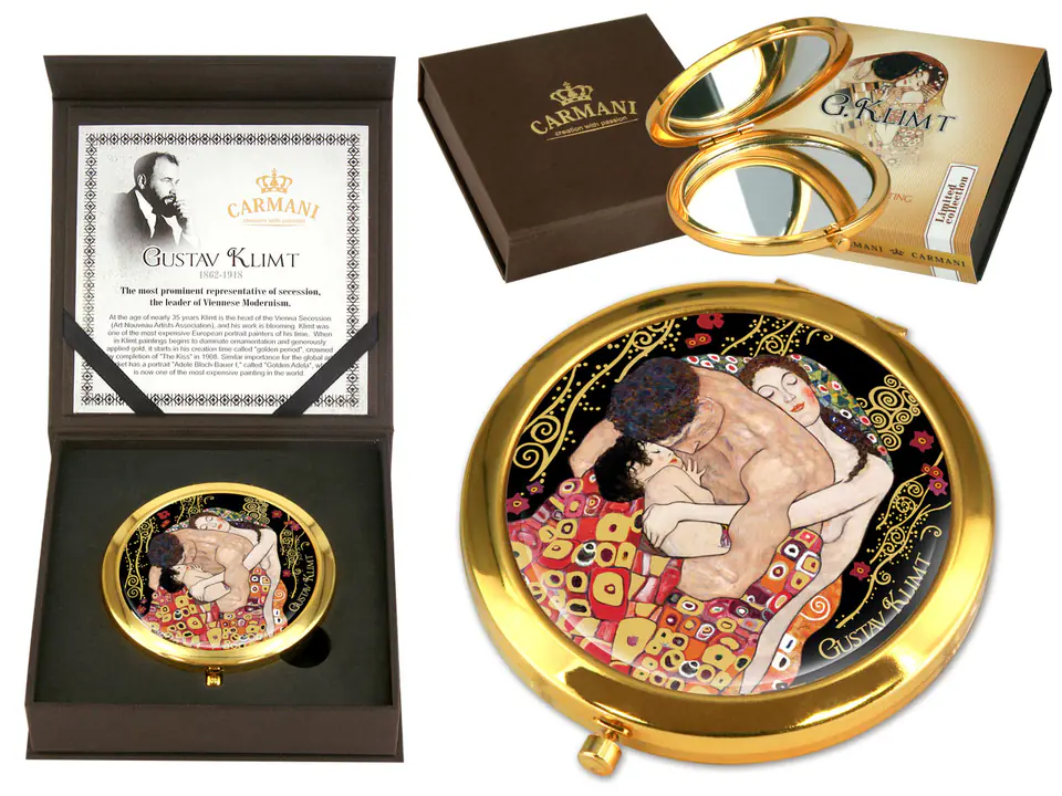 A charming little mirror with a motif of Gustav Klimt's work. Perfect for any female handbag. It takes up little space and its beautiful decorations add charm.