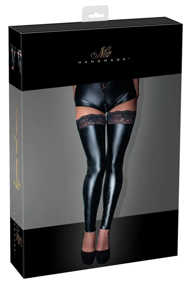 Very elastic, black stockings (without feet) made of sexy shiny material. Top decorated with lace. They perfectly fit the legs and do not slip, thanks to the silicone finish.